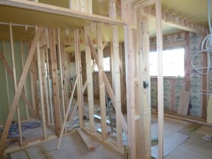 電気配線や断熱材が入れ終わりましたので、壁下地材のベベルボードを施行して